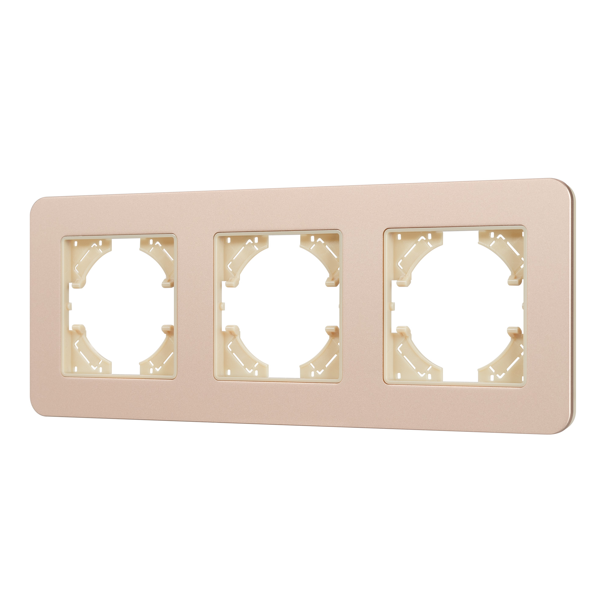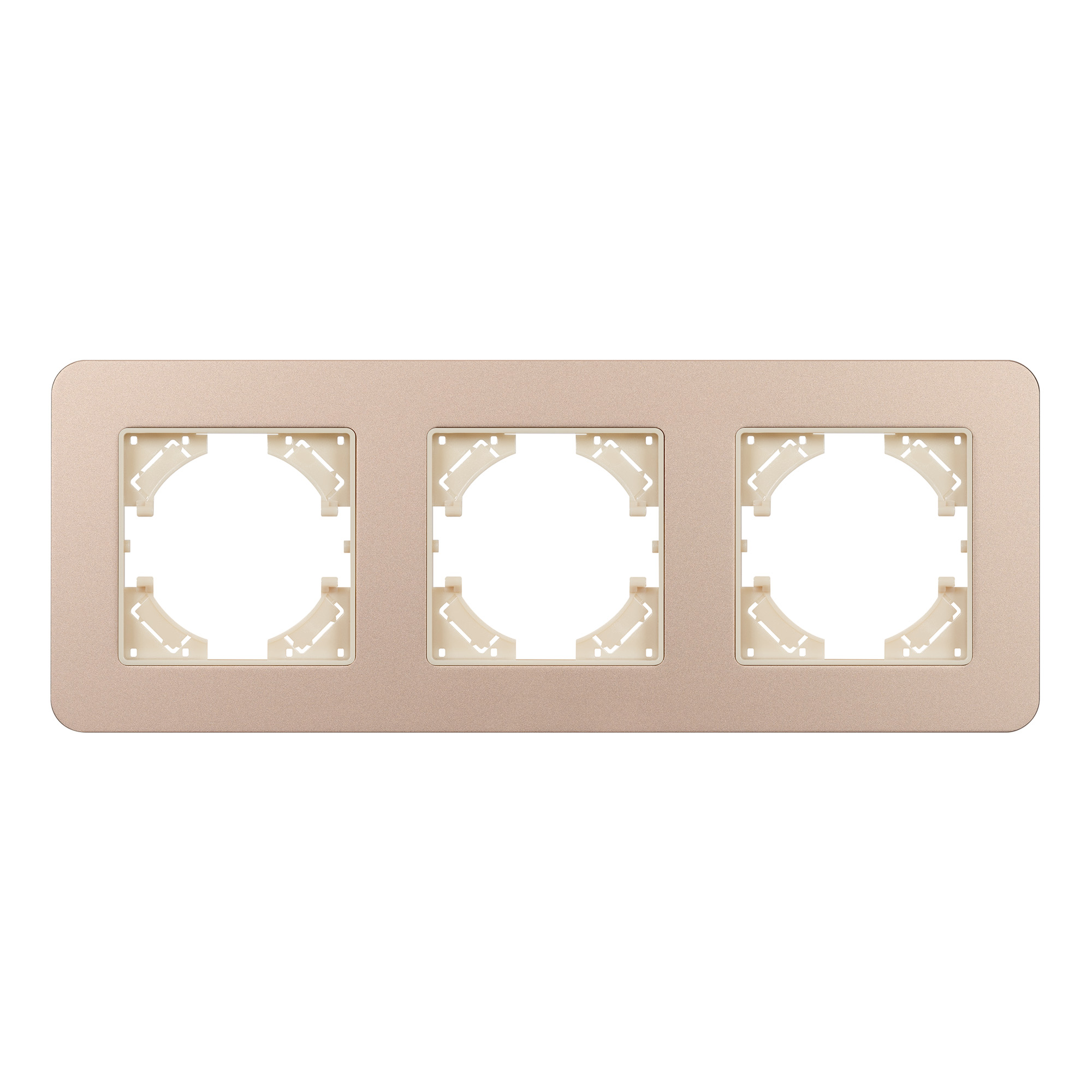 Рамка алюминиевая на 3 поста, под встраиваемый механизм. Цвет - золотой с Soft-Touch покрытием. Среднего уровня герметичности IP20. Ориентация монтажа - горизонтальная (основным ориентиром служат посадочные выступы для накладки механизма).