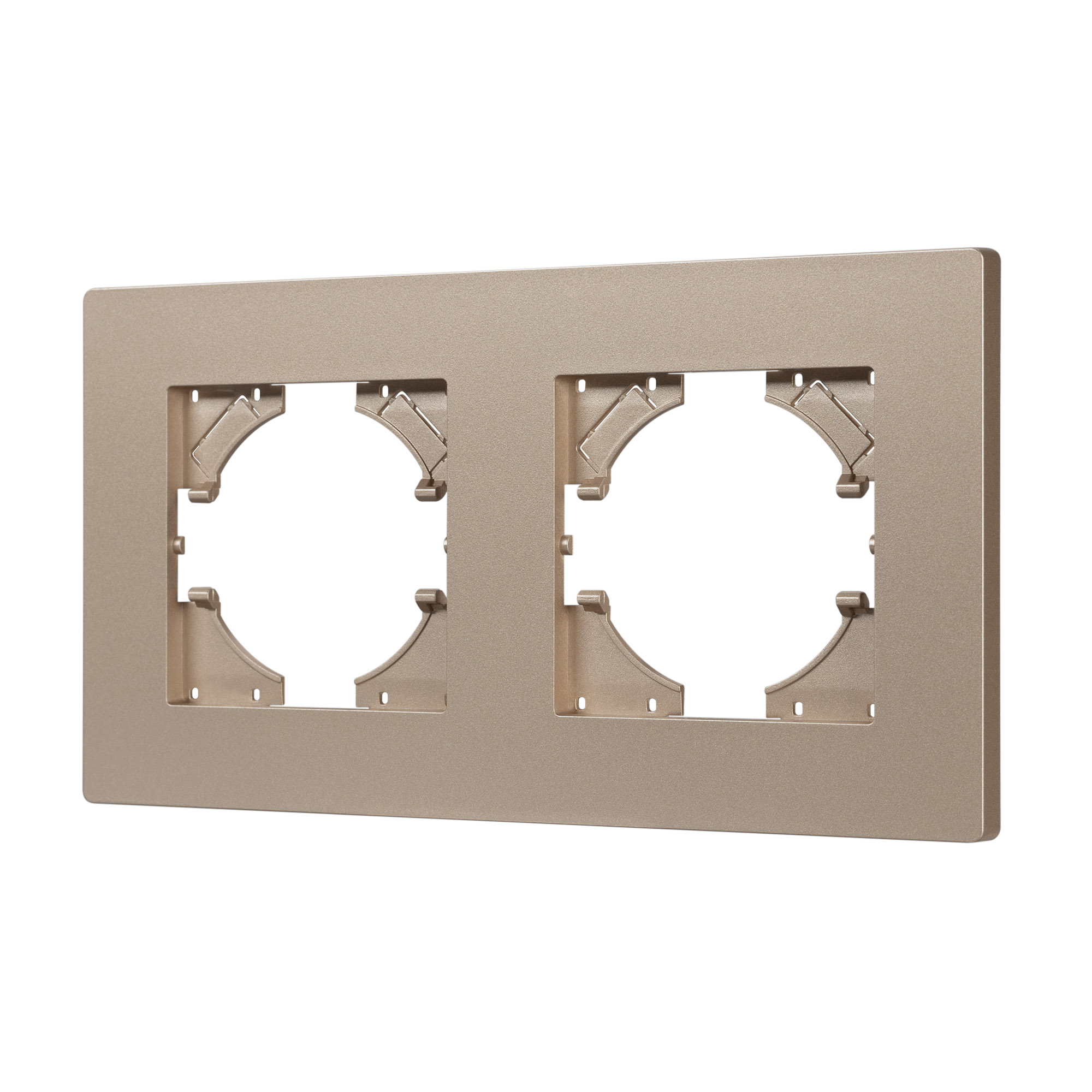 Рамка пластиковая на 2 поста, под встраиваемый механизм. Цвет - золотой. Среднего уровня герметичности IP20. Ориентация монтажа - горизонтальная (основным ориентиром служат посадочные выступы для накладки механизма).