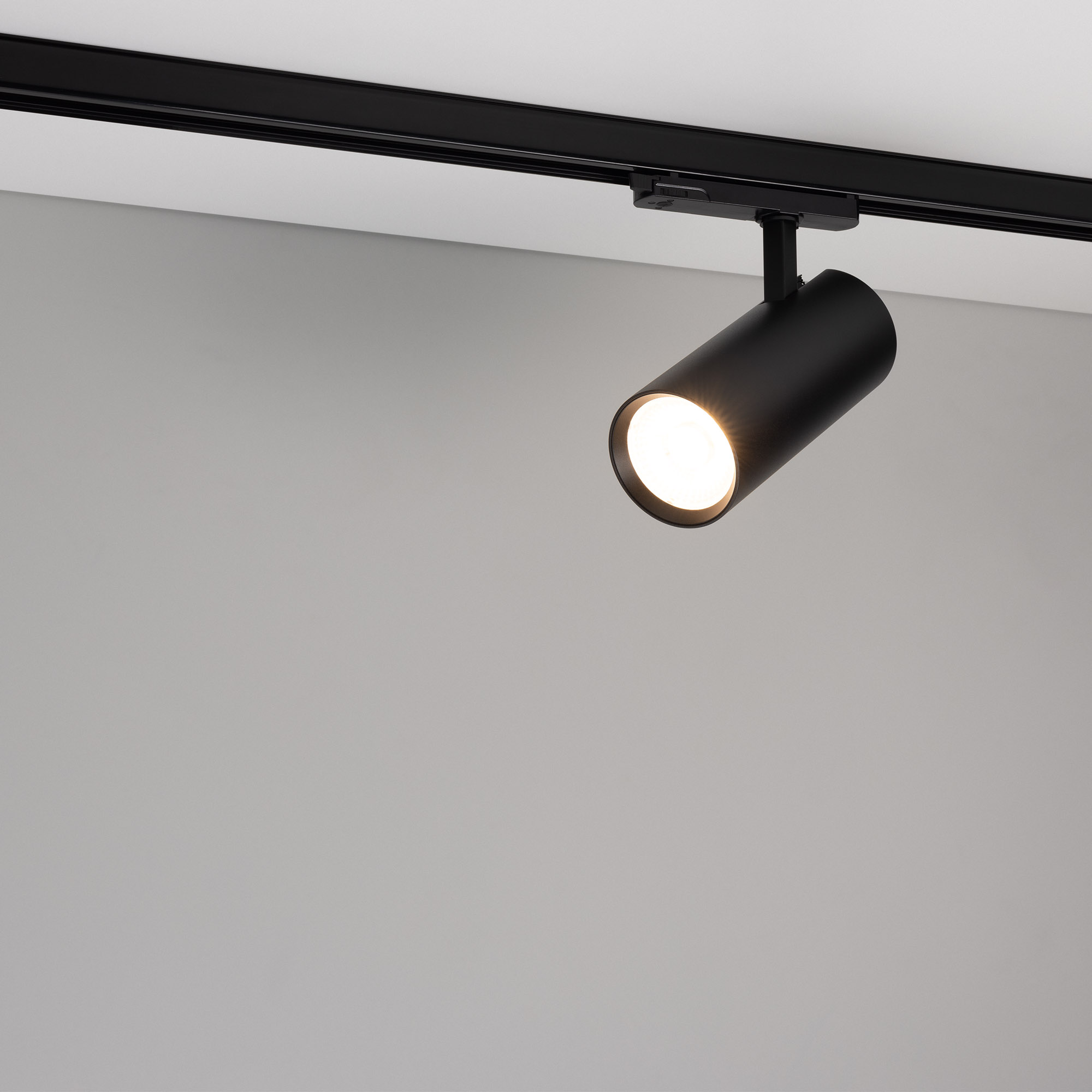 Светильник для треков/шин 4 провода. Мощность 40Вт, св. поток без решетки honeycomb 4000 лм, 100 лм/Вт, с решеткой honeycomb 2640 лм, 66 лм/Вт, теплый 3000 K, CRI>90, угол 15°, напряжение питания 230 В. Черный круглый корпус из алюминия, материал линзы PMMA, степень защиты IP20. Размер: диаметр 90 мм, длина световой части 141 мм. Монтаж на трек 3-фазный. Драйвер встроенный 24-42 В, 750мА., пульсация <5%