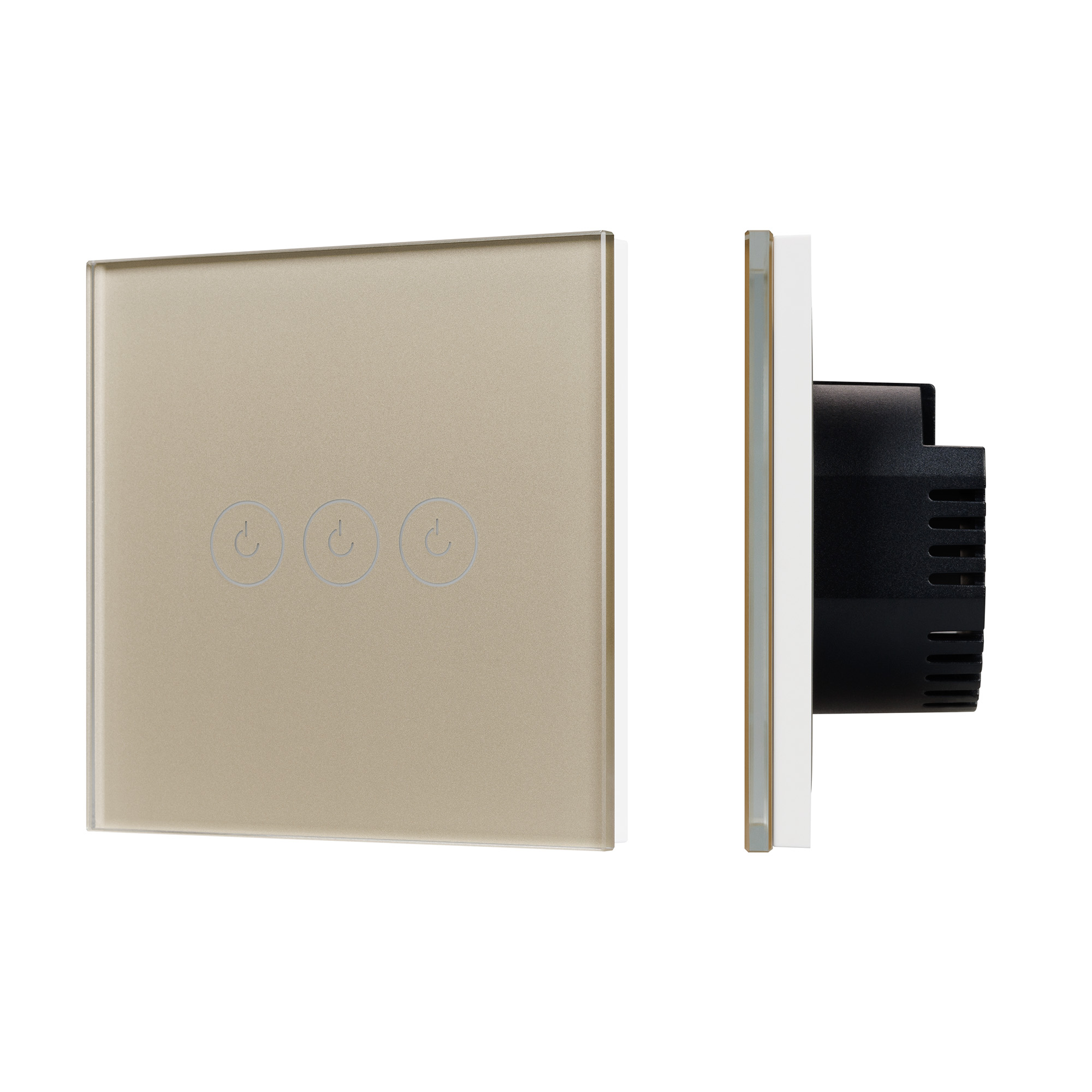 Сенсорный выключатель света на 1 пост 3 клавиши. Цвет - золотой. Клавиши имеют статичную LED подсветку - синего свечения. Уровень пылевлагозащиты IP20. Выключатель устанавливается в стандартный круглый подрозетник круглого сечения диаметром 60мм. Габаритные размеры: длина 86 мм, ширина 86 мм, высота 35 мм (9 мм высота от стены). Гарантийный срок 24 мес.